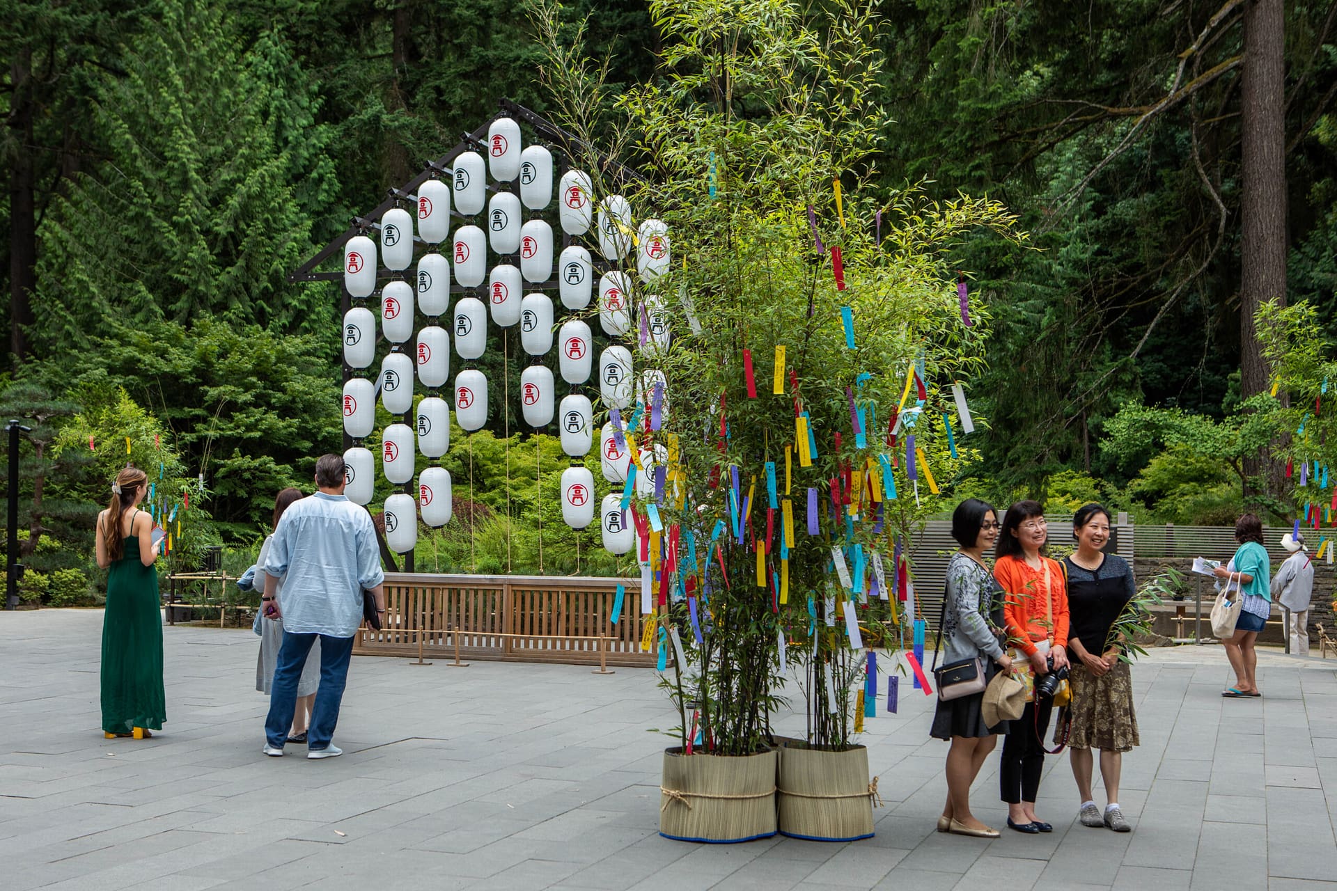 The Gion Festival lanterns bear the crest of the sponsoring neighborhood, and those on view at the Garden in the Cultural Village were custom-made in Kyoto for the 2018 exhibition. They bear the stone lantern crest of the Portland Japanese Garden with “Japanese garden” in kanji on the back.