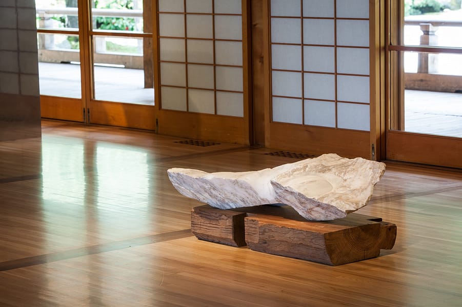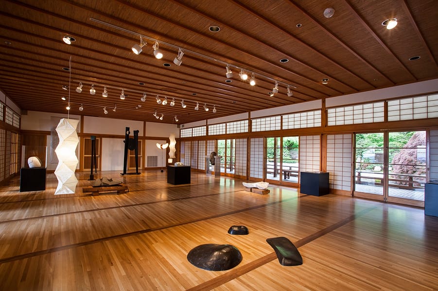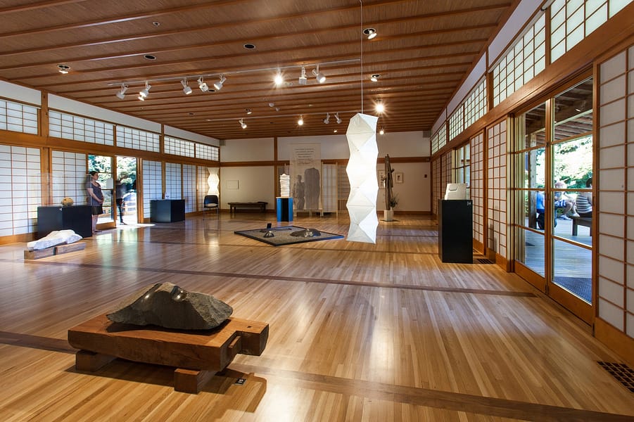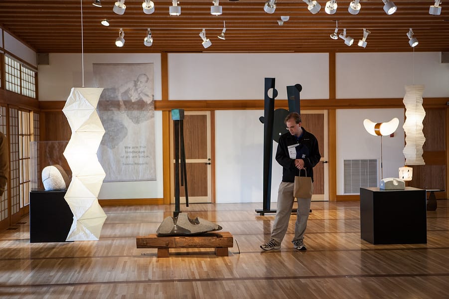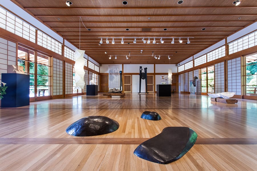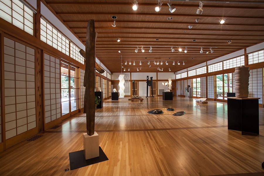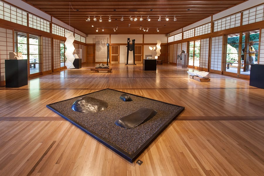 Co-created by Matthew Kirsch of the Noguchi Museum, and Diane Durston, the Arlene Schnitzer Curator of Culture, Art, and Education at the Portland Japanese Garden, this exhibition was on loan to the Garden from The Noguchi Museum in New York. The works in this exhibition date from the late 1940s to the mid 1980s, spanning the artist’s long career in sculpture and design. The exhibition featured 22 works in stone, metal, and paper on view in the Garden Pavilion Gallery with a selection of large scale stone work on view outdoors on the Overlook Courtyard.