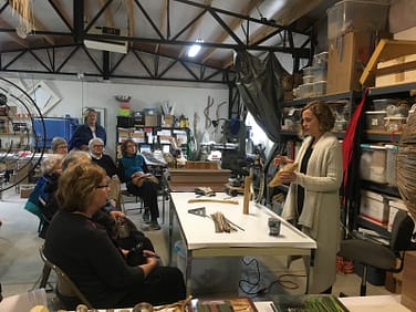 On a warm day in late June, more than a dozen Portland Japanese Garden docent volunteers visited bamboo artist Anne Crumpacker’s Portland studio. Crumpacker gave a short presentation on her background, education, and the inspiration behind her pieces.