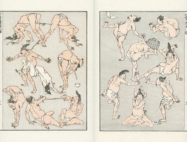 The exhibition compares and contrasts contemporary Japanese manga with Hokusai Manga, a collection of superb illustrations by Katsushika Hokusai (1760-1849), the renowned ukiyo-e artist recognized the world over for his iconic woodblock print The Great Wave. The original 800-page edition of Hokusai Manga was published from 1814 to 1878 in 15 stitched-bound volumes. It included 4,000 images, woodblock-printed in three colors: black, gray, and pale flesh.