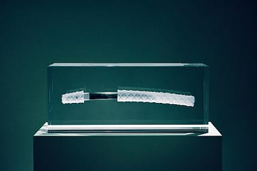 Appropriating traditional signs of Japanese elegance and refinement, Tatehana removes these signs from their original historical context of past centuries and amplifies their symbolic meaning in his art. In Heel-less Shoes, the raised platform sandals (denoting the highest-level courtesans) are removed from the cobble pathways of the Yoshiwara entertainment district of the 18th and 19th centuries and refashioned to grace the feet of current society’s most fashion-forward celebrities like Lady Gaga and Daphne Guinness. In Hairpin Series, the elaborate lacquered hairpins used in the coiffures of the most refined geisha entertainers of Kyoto’s Gion district are recreated as monumental 3-dimensional forms that embody elevated status and accomplishment while removing any possibility of utilitarian purpose. And in Void Sculpture Series, the exquisitely crafted sword blades of the samurai are removed from their poetically violent potential to create sculptural works of the most captivating beauty and exquisite craftsmanship. The success of Tatehana’s art and design comes through recognition of these long-held symbols that epitomize celebrated craftsmanship and his thoughtful refashioning of his output for contemporary appreciation.