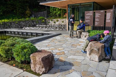 Twenty-six large stone pavers were repurposed and placed, both in the Chabana Garden and at the Garden shuttle turnaround. The shuttle turnaround was reconfigured with the paving stones, which now makes it easier for the shuttle to transport Garden guests up and down the hill.