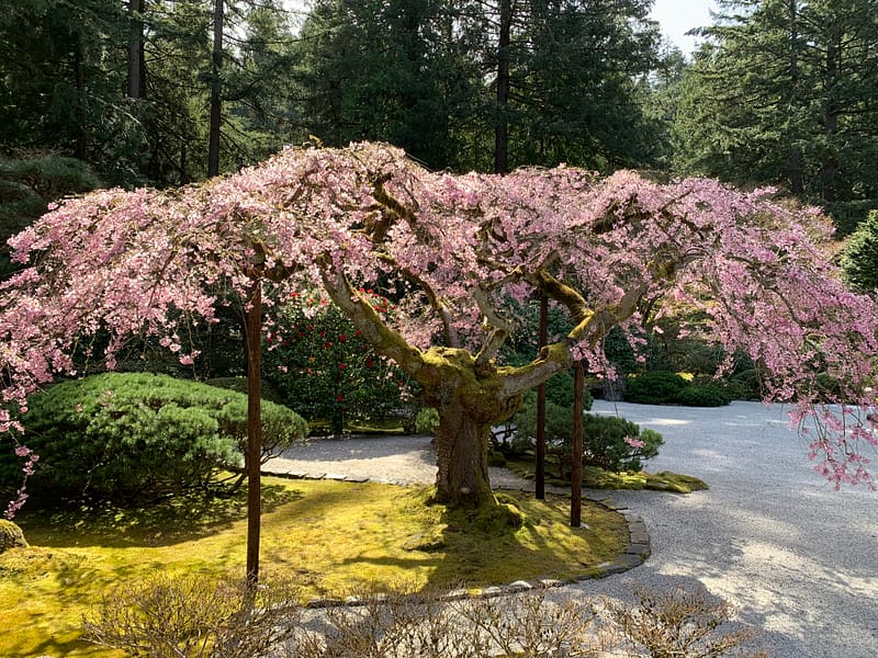 All of our cherry trees are currently in bloom, bringing an uplifting pop of color against the shades of green. Our weeping cherry has delicate pink blooms, while Cherry Hill with Yoshino Cherry trees have flowering white and soft pink blooms. The towering cherry tree near the Nezu Gate creates springtime scenes from several unique perspectives.