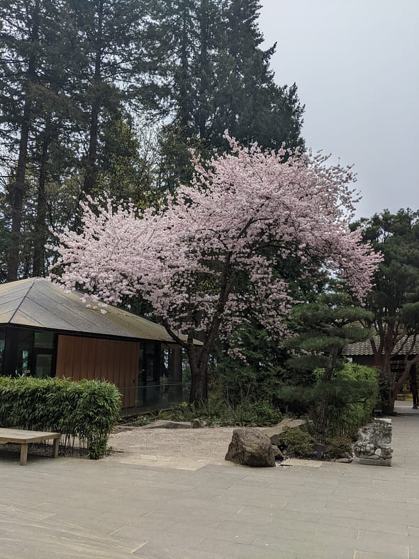 A look at the Yoshino Cherry tree next to the Umami Café from behind the Moon Bridge in the Strolling Pond Garden.