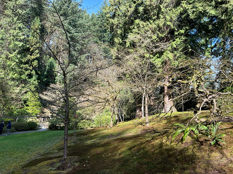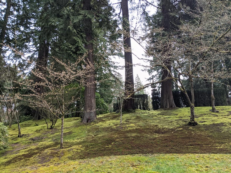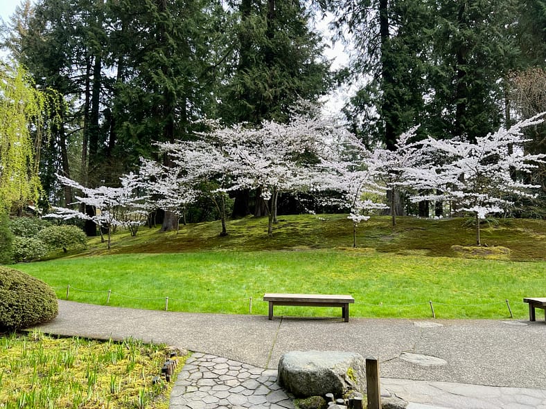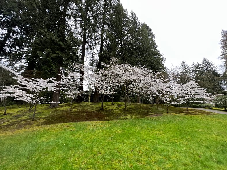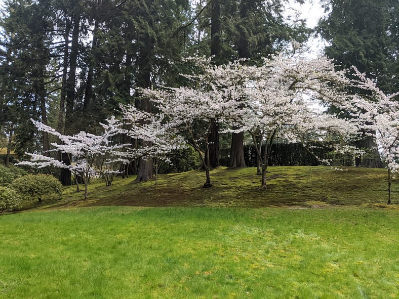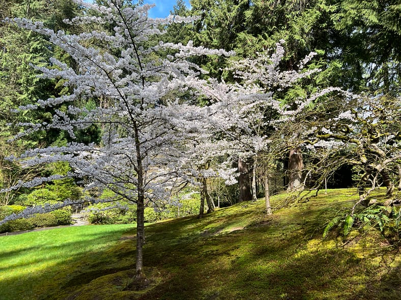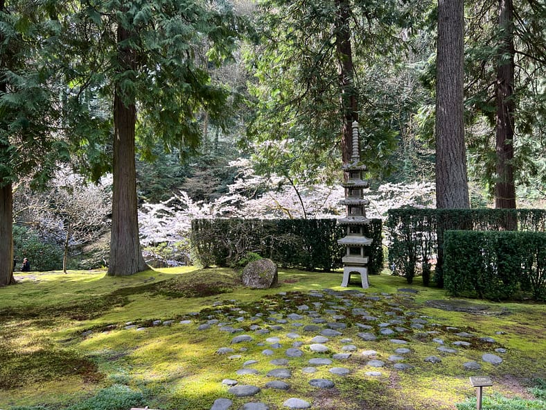 The blooms of the Yoshino Cherry trees across from the Heavenly Falls are now visible past the yew hedges and Sapporo Pagoda lantern.