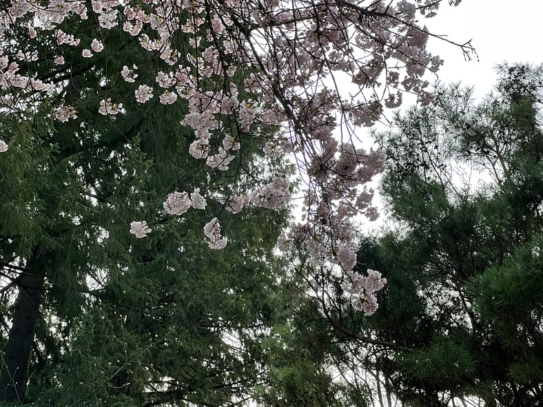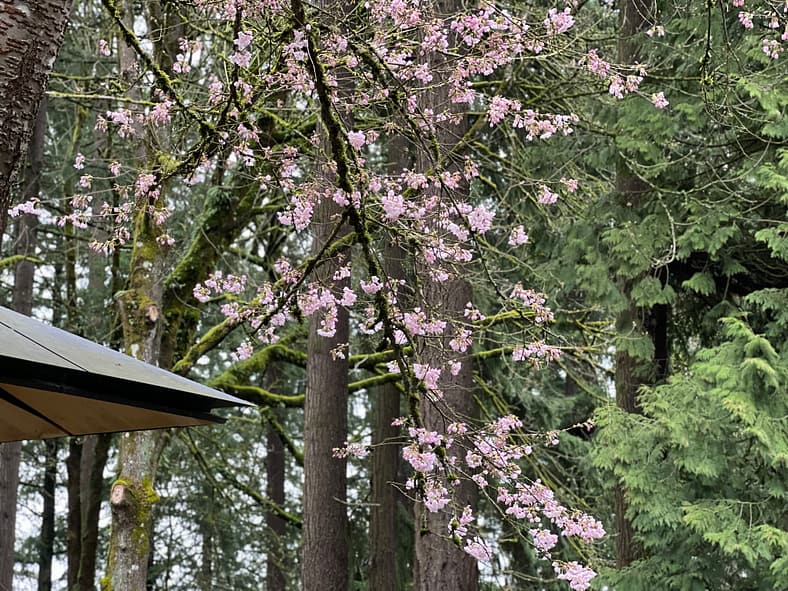 A closeup of the Yoshino Cherry tree next to the Umami Café.