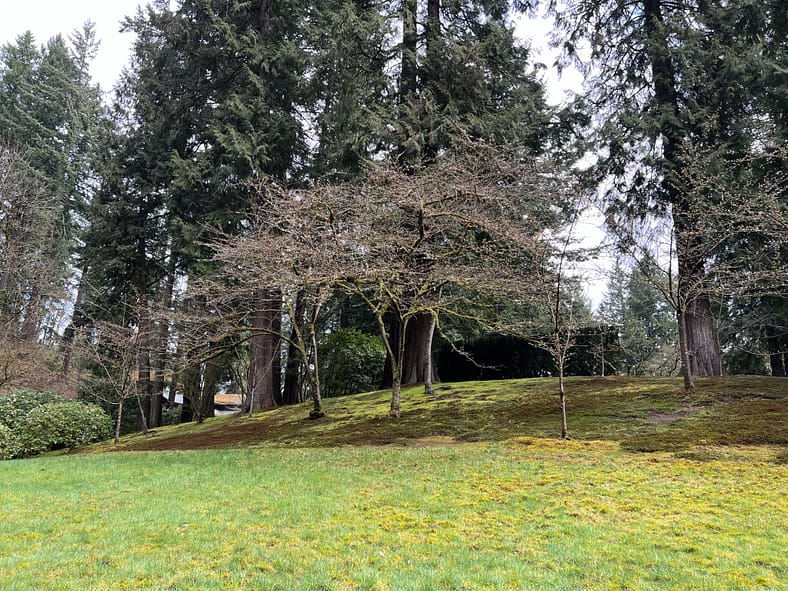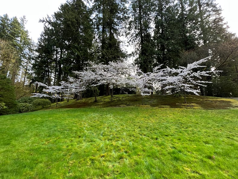 A wide shot of the Weeping Cherry in the Flat Garden.