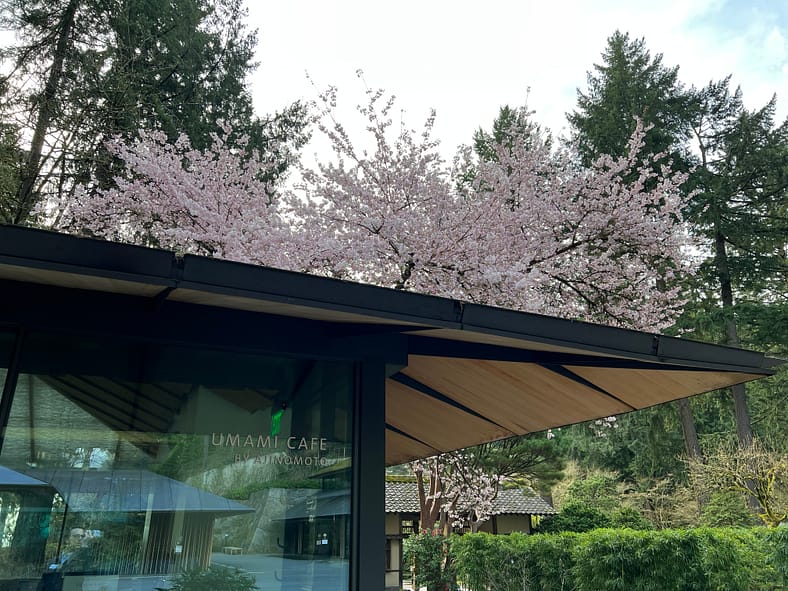 The Yoshino Cherry tree next to the Umami Café, as seen from the Atsuhiko and Ina Goodwin Tateuchi Foundation Courtyard in the Cultural Village. The blossoms are starting to shed their petals.