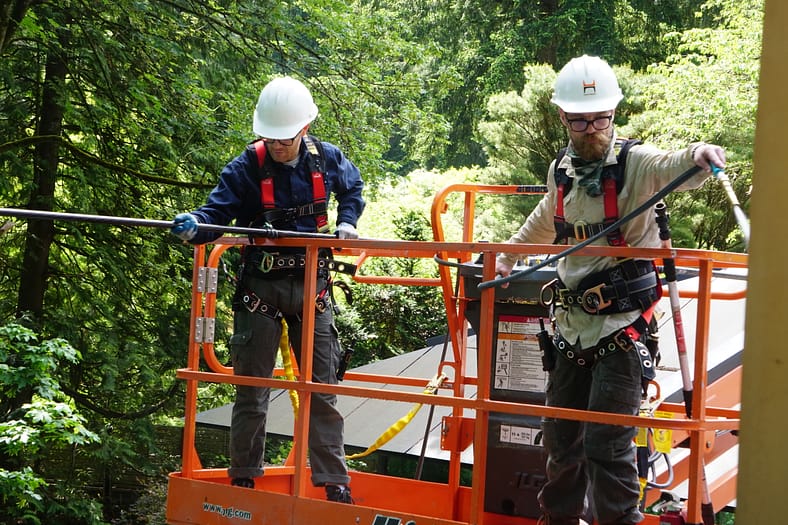 “We clean the upper buildings using a sixty-foot articulate boom lift, because accessing them otherwise is very difficult to do safely,” Sipe shared. “Our facilities team, Greg Ballard and Jon Baker, have been trained to become certified lift operators and know how to use their safety harnesses.”