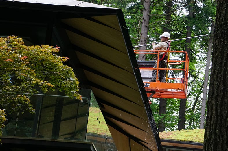Approximately three times a year these roofs must be cleaned, “Because of the various environmental debris, such as pine needles, leaves, pollen, sedum drippings, or random dirt,” said Portland Japanese Garden Director of Facilities and IT, Jason Sipe. “We need to clean off the cold-rolled aluminum panels so they don’t stain or develop too much of a dirty patina.”
