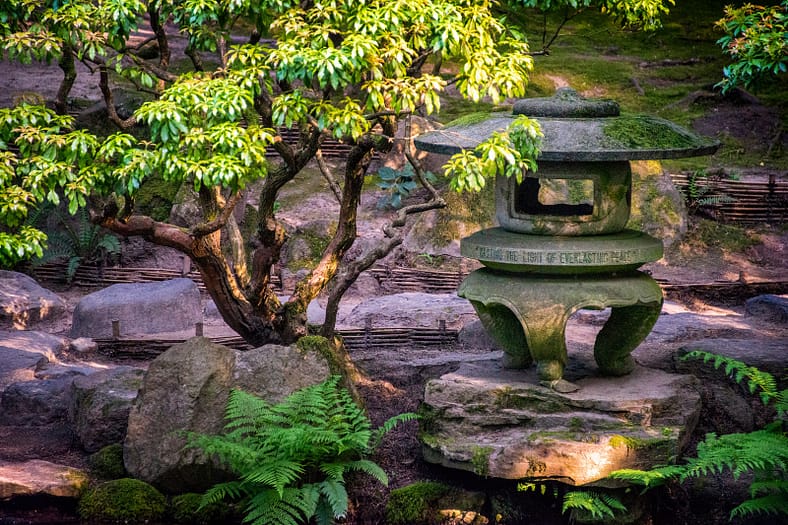 On the eastern bank of the upper portion of the Strolling Pond Garden, a stately yukimi doro (a stone lantern with tripod legs) stands among evergreen shrubs, ferns, and dappled sunlight. Stylized in the snow lantern form, the lantern’s firebox is directly underneath a broad sloping roof resembling a traditional Japanese hat made from rush (kasa). In English, a message of hope is inscribed in capital letters: CASTING THE LIGHT OF EVERLASTING PEACE. This lantern, referred fondly as the Peace Lantern, first took a voyage across the Pacific Ocean before finding its home in Portland Japanese Garden.