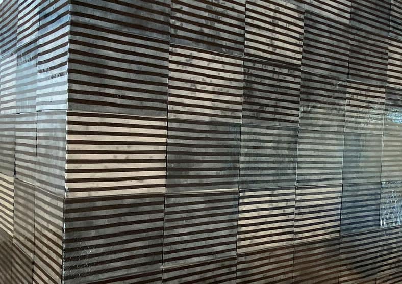 Lines are ever-present in Kaneko’s work. On permanent display in the Jordan Schnitzer Japanese Arts and Learning Center are a series of Kaneko’s wall tiles, a gift from Portland’s Bullseye Glass Company (above). Individually, each tile is an abstract work of art, but in combination they take on the role of an almost site-specific installation that transcends its parts. Kaneko likens the rigid yet organic lines that define some of his work to the ridges of a Japanese rock garden. The tiles together create a feeling of looking at the ripples of a quiet ocean or call to mind the surface of the Sand and Stone Garden.