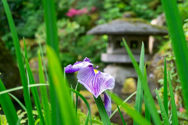 As Portland Japanese Garden transforms into a picturesque and verdant haven, the irises provide a pop of color as the harbinger of summer. The buds typically open in late June to reveal flowers nearly six inches across in shades of purple and white. Symbolizing purity and innocence, the narrow iris leaf resembles the shape of a samurai sword blade.