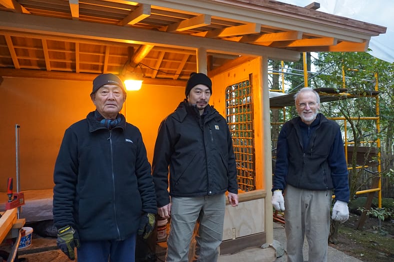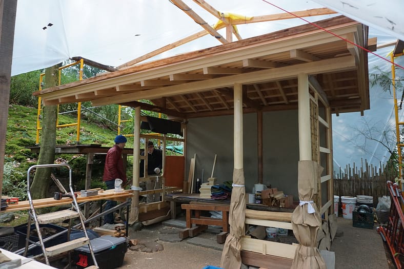 From December through the beginning of the new year, a beloved structure tucked away in the Natural Garden – the machiai (sheltered waiting arbor) – has gone through a long-awaited restoration project. The Natural Garden’s machiai was originally handcrafted in the 1980s with a high quality of workmanship and integrity of tradition. Authentically designed to sit without one front post so as to preserve an unobstructed view for those seated inside, the unsupported corner had begun to sag, pulling the roof, beams, and walls with it.