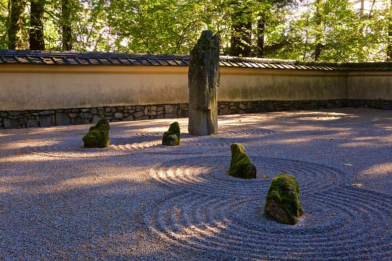The Sand and Stone Garden features stones in an arrangement that has often been interpreted as a depiction of the story of Buddha (the tall stone) sacrificing himself to feed starving tiger cubs (the seven smaller stones). William “Robbie” Robinson, former Head Gardener of Portland’s Parks and Recreation Bureau, and one of the most important contributors to the Garden’s construction, told McVicker that the efforts to source the tall “Buddha stone” almost went awry.