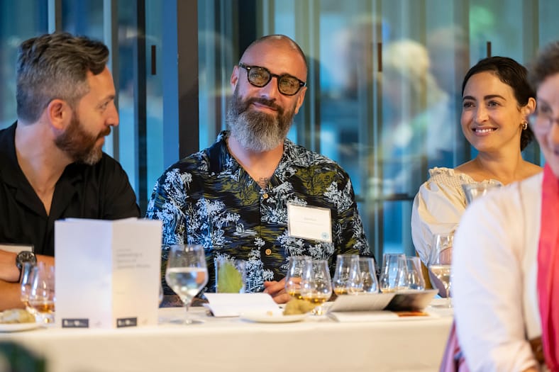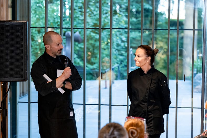 After the tasting concluded, guests moved to the Living Room area of the Jordan Schnitzer Japanese Arts Learning Center to enjoy a meal prepared by chef and culinary experience curator Marybeth Boller. Following her studies at Providence College and the International Culinary Center, Boller would be mentored by celebrated chefs Jean Georges Vongerichten and Michel Roux before becoming the Executive Chef at the legendary dining destination, BG at Bergdorf Goodman and then the U.S. Embassy residence in Japan under Ambassador Caroline Kennedy. Working with the team at Devil’s Food Catering, Boller’s menu for In Praise of Time included halibut tataki, langoustine (shrimp pillow, shellfish broth, and warm ginger vinaigrette), a pan-seared American Wagyu hanger steak, and aged soy sauce and hazelnut cake for dessert, all paired with cocktails from Jim Meehan.
