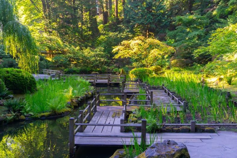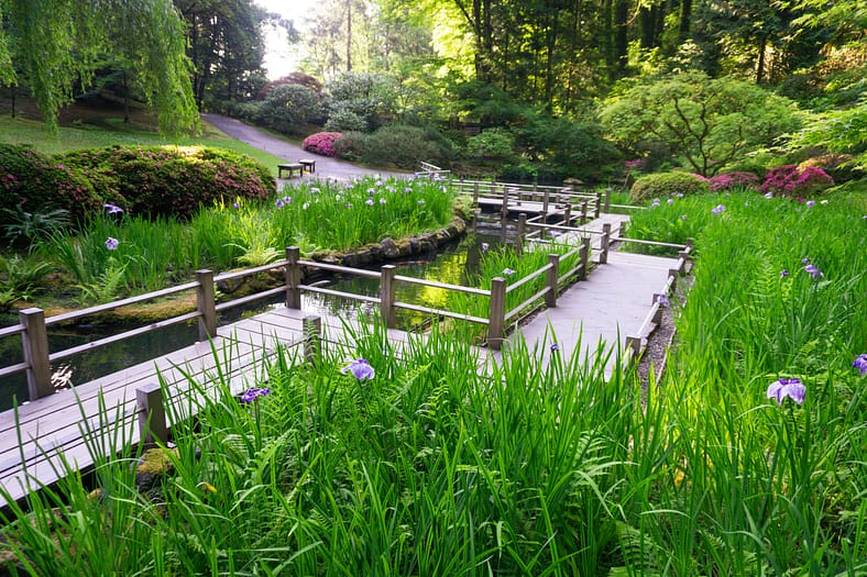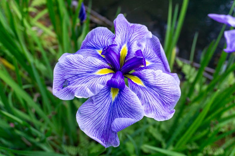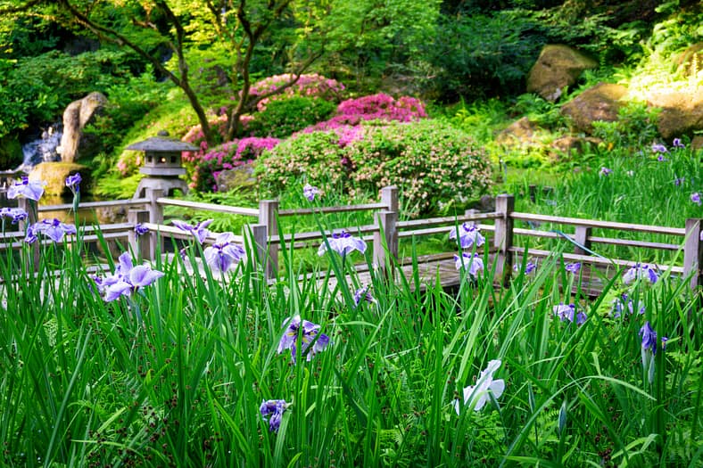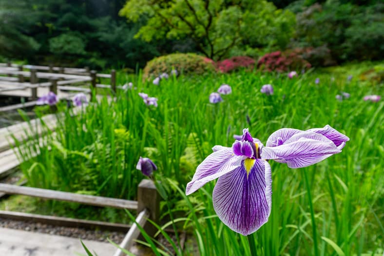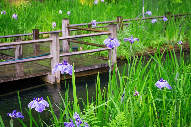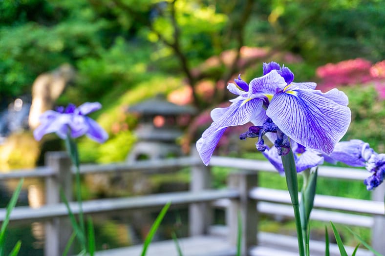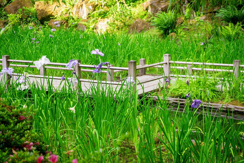 One of the horticultural highlights of Portland Japanese Garden in summer are the blooming of irises alongside the Zig-Zag Bridge. While every year is different, the Garden’s irises tend to bloom in late June, just as it officially becomes summer. To help plan your visit to see them, we have created this page that will be regularly updated until their blooms conclude. The best way to view these stunning flowers is by becoming a member. In addition to the many benefits of a Portland Japanese Garden membership, those who join are able to visit during exclusive hours every morning the Garden is open (8:00 – 10:00am), a time when the Garden is less crowded during these busy summer months.