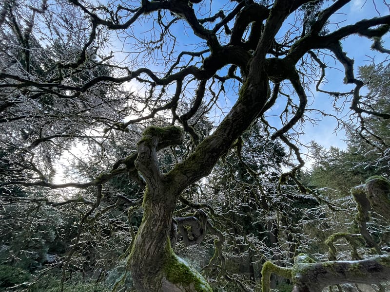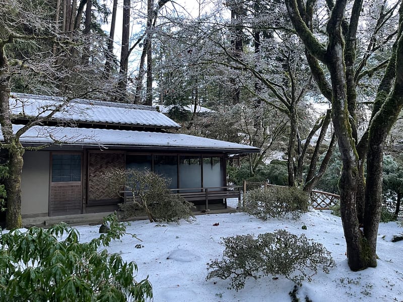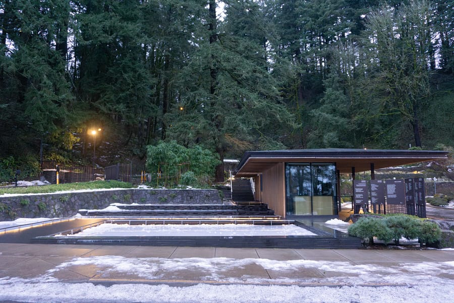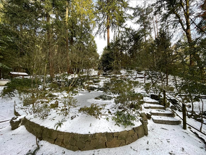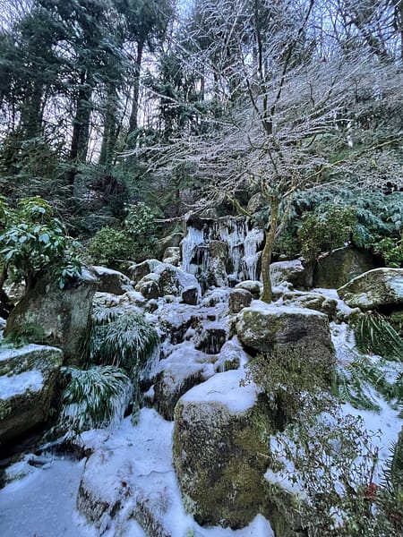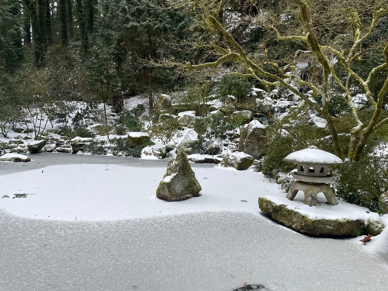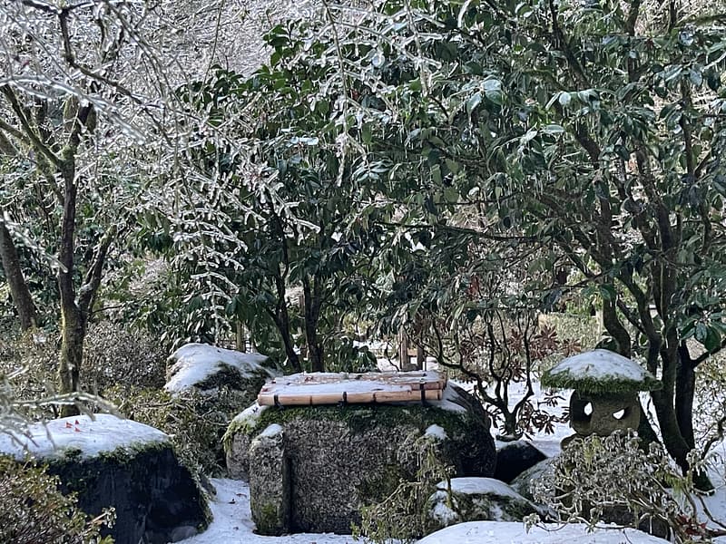 Perched at a higher elevation than much of Portland, the combination of freezing temperatures, high wind speeds, and freezing rain had an adverse impact on Portland Japanese Garden. Where ice melted through many parts of the city, it persisted throughout our grounds, making it difficult to traverse. Fortunately, due to the tireless work of its Garden, Facilities, Visitor Relations, and Security departments throughout the worst of the storm, damage was mitigated and its koi were protected and kept safe.