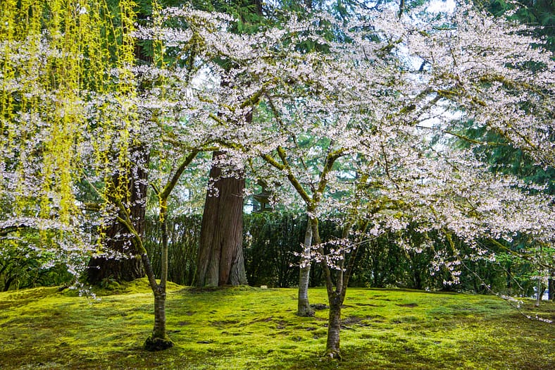 Some areas throughout Portland, Oregon offer a dazzling abundance of cherry blossoms to enjoy, such as the Tom McCall Waterfront Park alongside the Willamette River. Portland Japanese Garden takes a different approach, with a more curated collection specifically placed to create tableaus that harmonize the white and pink blooms with the many hues of green throughout our landscape.