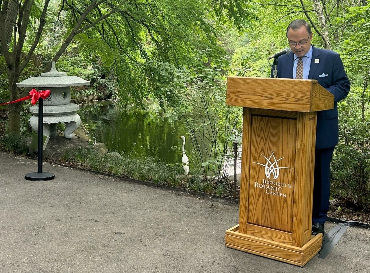 Adrian Benepe, President and CEO of Brooklyn Botanic Garden, who stopped to acknowledge the presence of the feathered guest, was the first to deliver remarks and shared incredibly kind words about Portland Japanese Garden. “We aspire to be as a great a Japanese garden as the one in Portland,” he remarked. “We’re good. They’re great. If you haven’t been there and you want to see the best Japanese style garden outside of Japan, you need to go to Portland, Oregon.”
