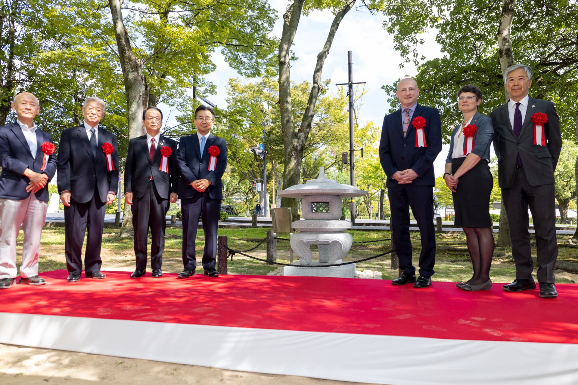 The Garden initially began donating handcrafted replicas of the Peace Lantern in 2017, the first city being Yokohama, Japan. As the Japanese city was preparing for the nation’s prestigious Annual National Urban Greenery Fair, Portland Japanese Garden Curator Emeritus Sadafumi Uchiyama was approached for advice from his sensei, landscape architecture expert Professor Isoya Sinji, who sought to include something tangible and symbolic to the proceedings. After a series of conversations and a pair of stone masons visiting Portland to take measurements, a replica was crafted and installed in Yokohama’s Higa-en, a small yet handsome park.