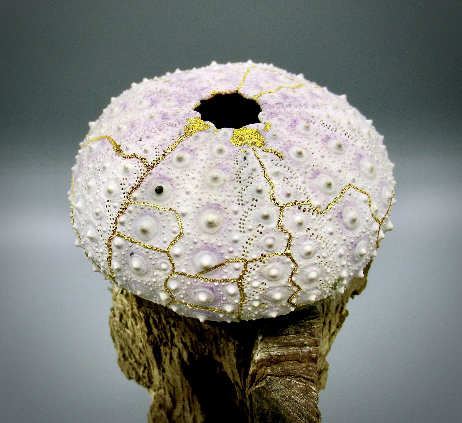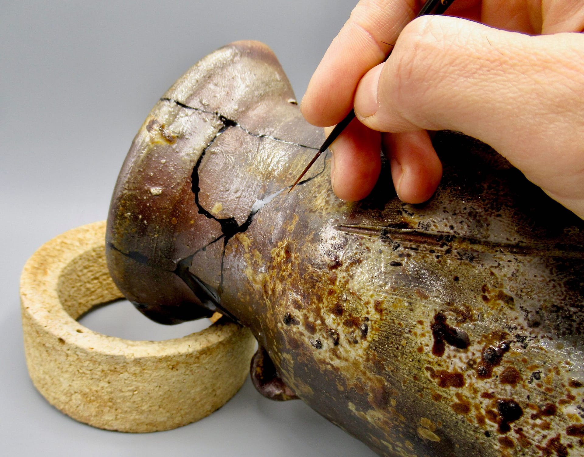 “The kintsugi process is time-consuming—it takes several months to complete a piece. The first step is to reassemble the fragments of a broken object with Mugi-Urushi, which is made from wheat flour and water with urushi lacquer. Once reassembled, joints and chips need to be filled with Sabi-Urushi, which is made of stone powder, water, and urushi lacquer. The filler needs to be sanded to make a smooth surface. Then several layers of urushi lacquer are applied over the filler. Finally, gold powder is applied and polished up. It is important to let lacquer cure properly between each process for a few days or weeks, and curing also needs to happen in very specific humid and warm conditions.”