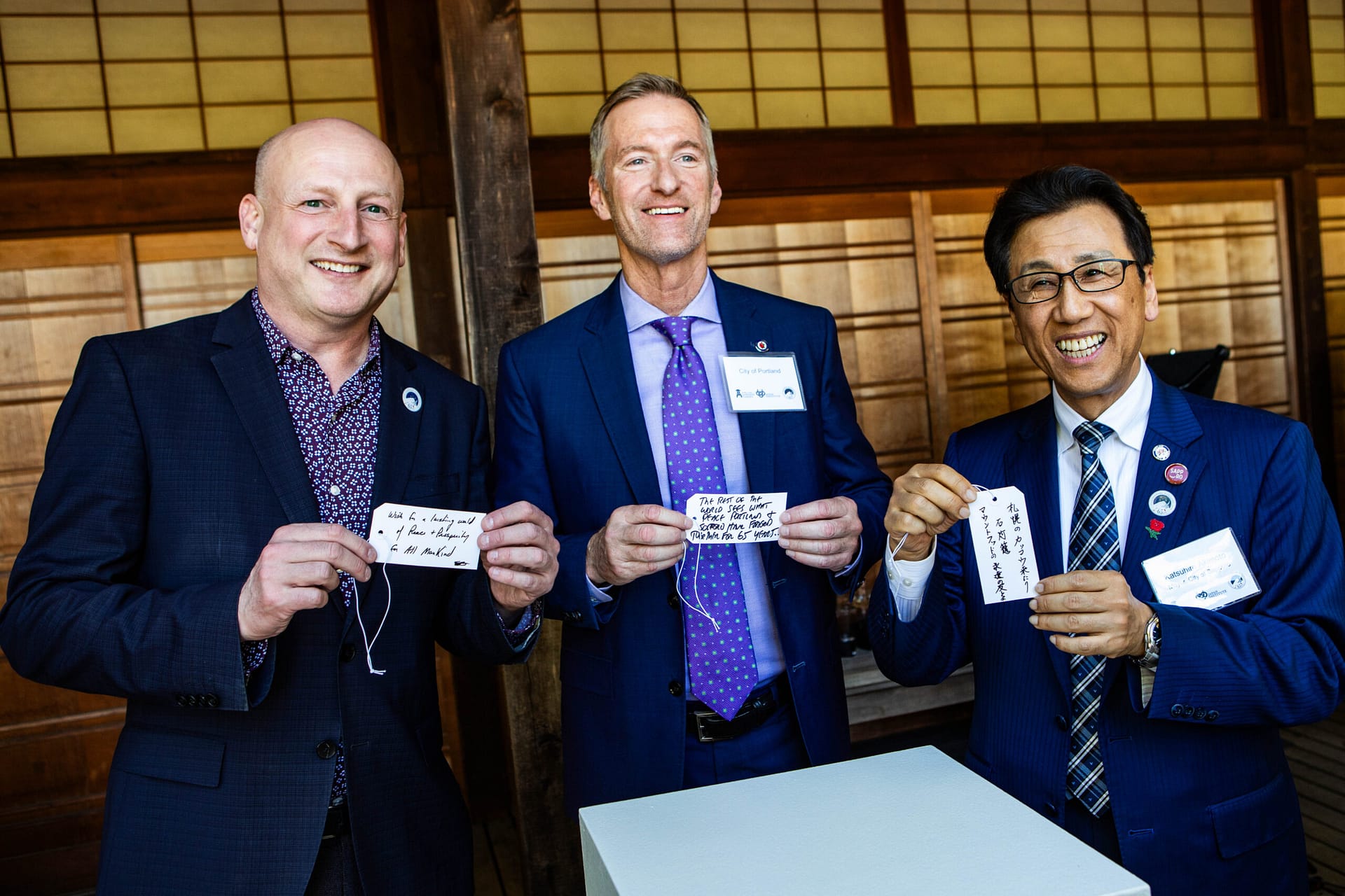 The formal remarks concluded with Mayors Wheeler and Akimoto as well as Portland Japanese Garden and Japan Institute CEO Steve Bloom writing down wishes for peace to be hung up on a Wish Tree, an art installation by peace advocate and artist Yoko Ono, held in the Garden in collaboration with gardens on four different continents and the Nobel Peace Center in Norway.