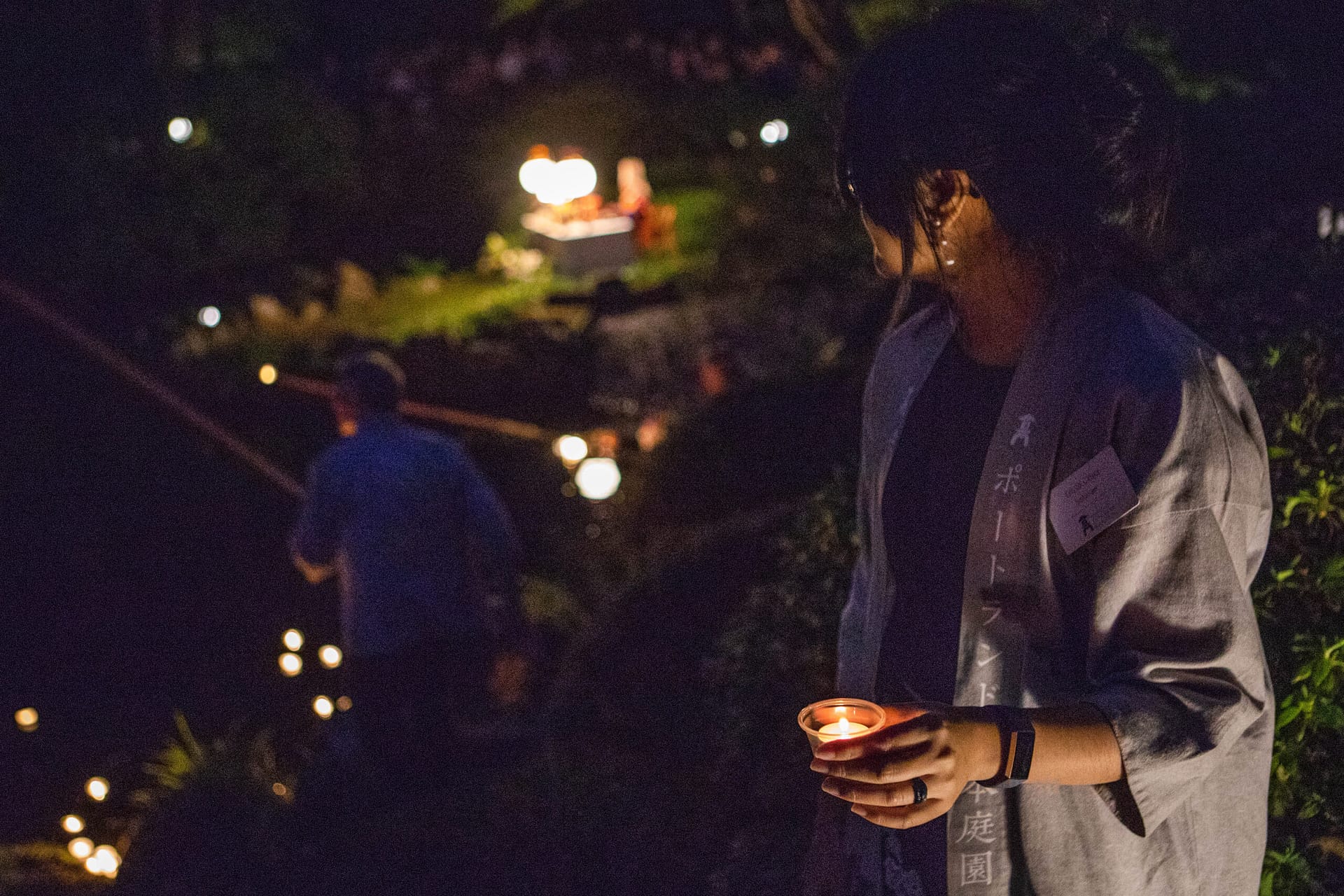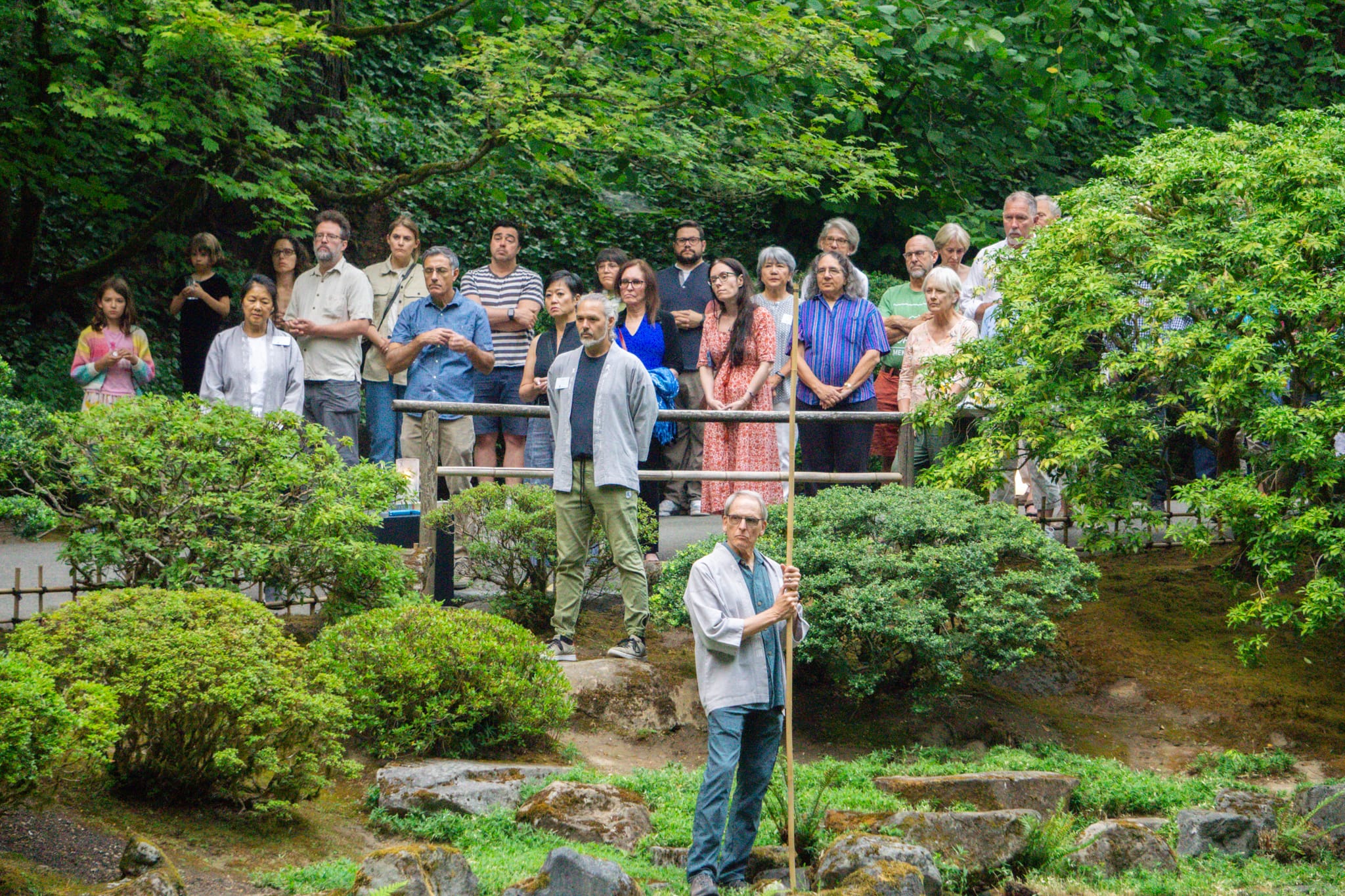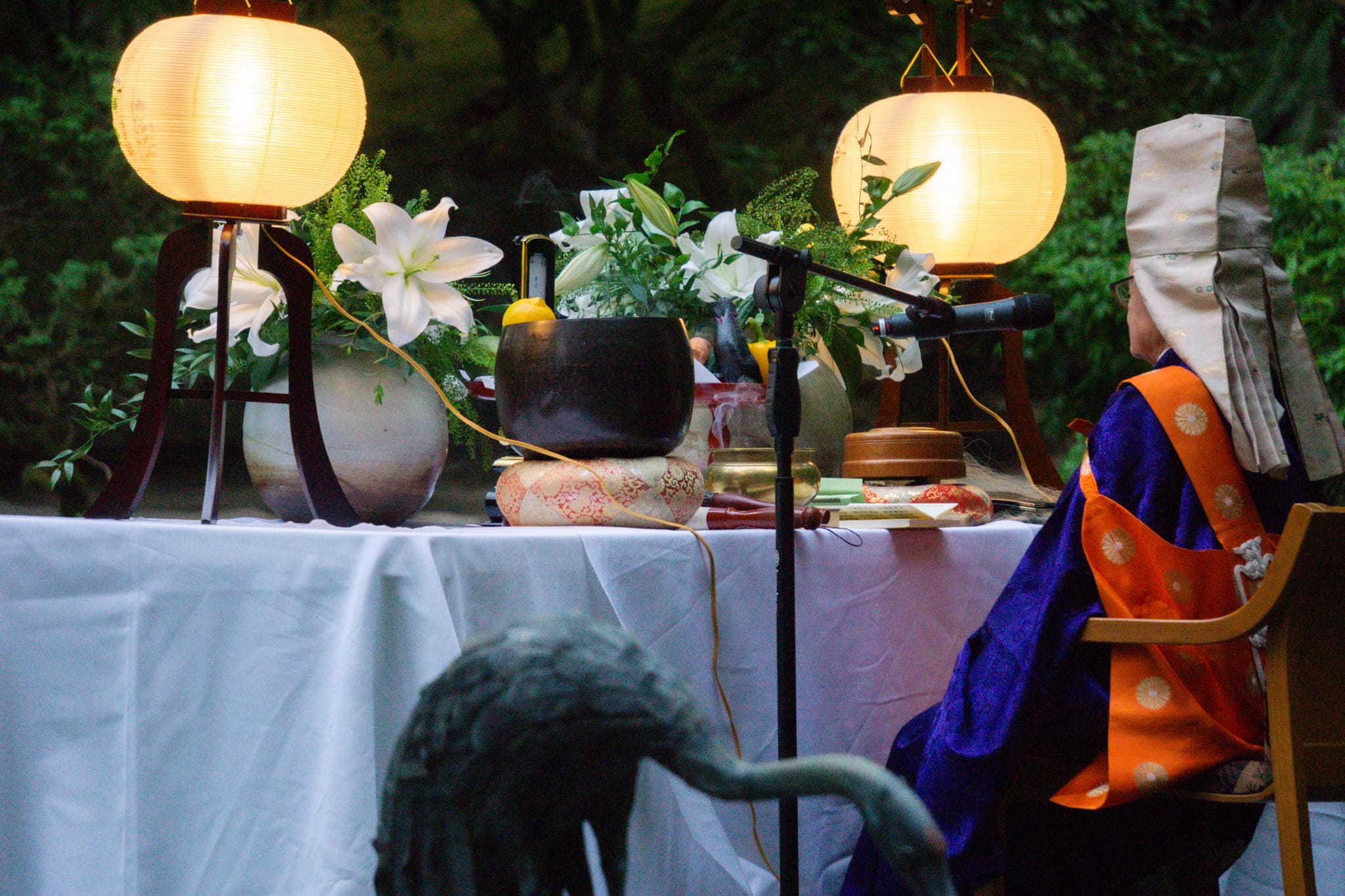 Adding to the evening’s warmth is the fact that O-Bon at Portland Japanese Garden is an annual family undertaking for the Kodachis. “On the days we hold O-Bon, Reverend and Mrs. Kodachi are accompanied by their family members, including grandchildren at times,” shares Mayuko Sasanuma, Director of Cultural Programs. “Their youngest son, John [who served on the Garden’s Board of Trustees, 2013-18], told me how Reverend Kodachi mentally and physically prepares himself in the months leading up to the event. This level of commitment and dedication really humbles me to be a small part of a nearly half-century of tradition that Reverend Kodachi carried; one that I’m sure will be passed on over generations to come.”