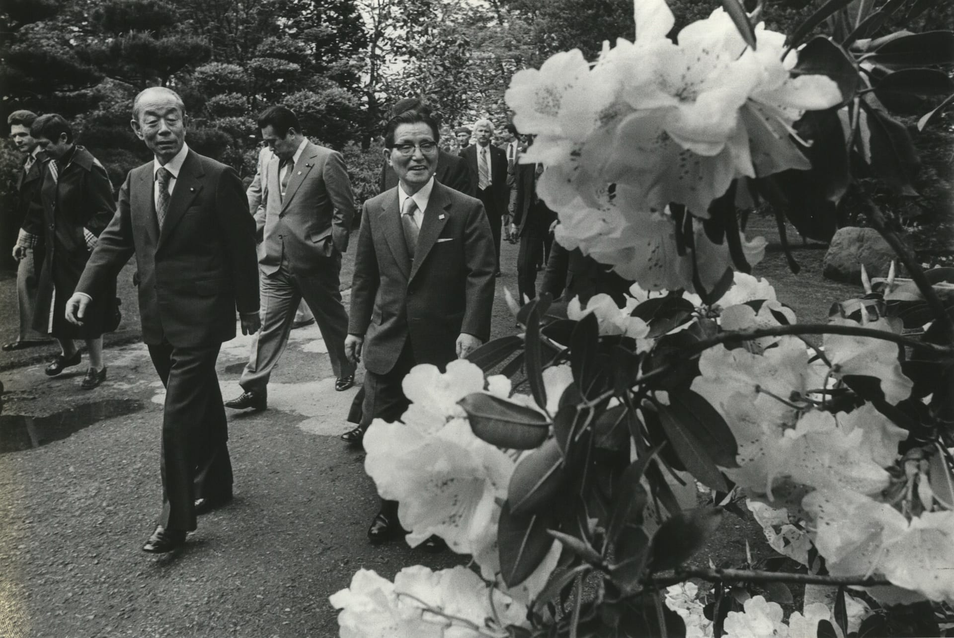 Prime Minister Takeo Fukuda served less than two full years in his role, but within his tenure, he managed to pay a visit to Portland Japanese Garden. En route to Washington, D.C. for a conference with President Jimmy Carter, Fukuda would become the first Japanese prime minister to visit Portland. Greeted at Portland International Airport by Oregon Governor Bob Straub and Portland Mayor Neil Goldschmidt, Prime Minister Fukuda was originally scheduled to take a rest from his travels at the Benson Hotel, but instead called for his limousine to take him and his cabinet ministers to the Garden. On a day replete with the blooms of rhododendrons and azaleas, the Prime Minister enjoyed his visit to the Garden in its spring colors. A staff member of Japan’s Consul General’s office in Portland told The Oregonian, “Mr. Fukuda was surprised and impressed by the size and beauty of the gardens. He didn’t expect anything like that.”
