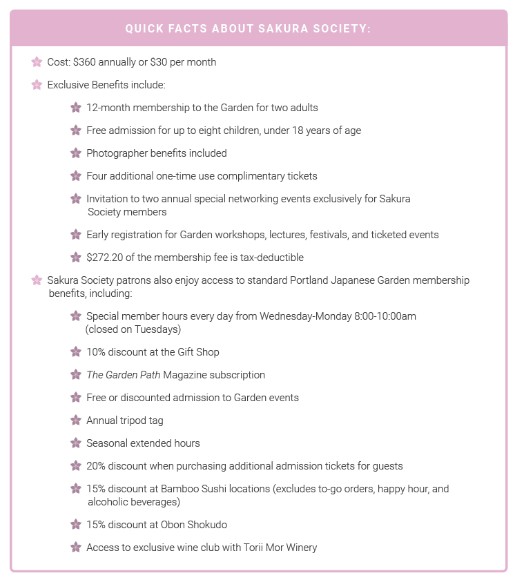 A membership in the Sakura Society will provide vital support to Portland Japanese Garden’s operations and programming and will help sustain it as a community resource. Additionally, it will enable us to continue serving the growing number of visitors the organization sees every year.