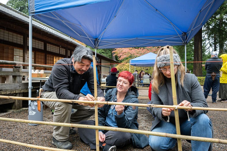 This Japanese Garden Training Center workshop, held at the Garden, taught participants to design and build a bamboo fence panel using traditional materials and techniques. The learning experience included a tour of the Garden focusing on bamboo fences, lectures, demonstrations with hands-on tool practice, and a knot-tying session. After the demonstrations, participants applied their new skills to build a Japanese bamboo fence under the guidance of staff gardeners.