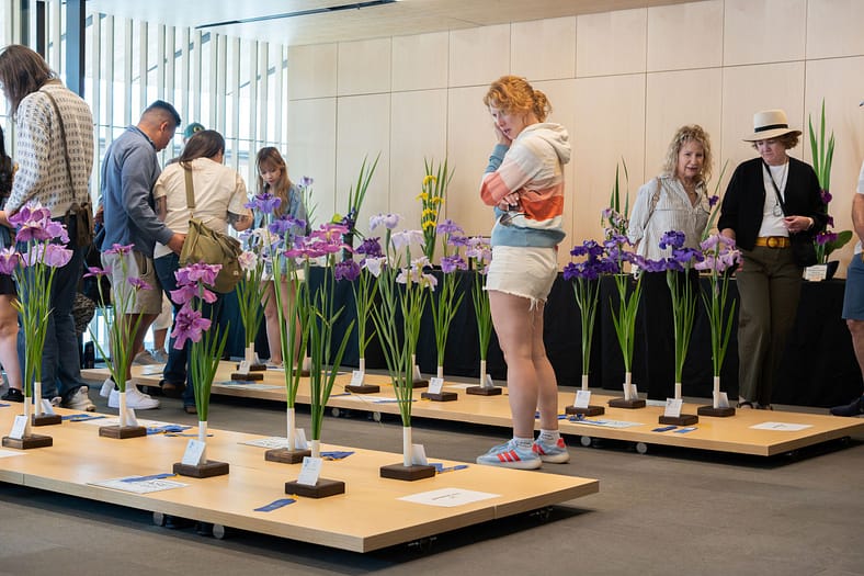 For a one day-only exhibition, the Greater Portland Iris Society presented an ikebana show featuring two varieties of late season irises: iris ensata (Japanese iris) and spuria. Native to Japan, Iris ensata is commonly known as “Japanese iris” outside of Japan. In Japan, 花菖蒲 (hanashobu) have been cultivated for over 500 years. Oregon and Washington are home to three of the nine specialty nurseries specializing in Japanese irises in the United States. As the Garden transforms into a picturesque greenscape, the Japanese iris provide a pop of color as the harbinger of summer. The buds open in late June to reveal flowers nearly six inches across in shades of purple and white.