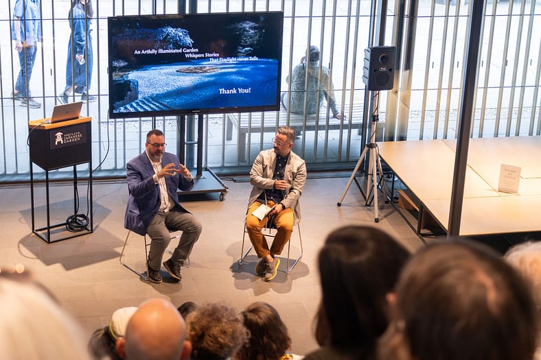 In 2025, the Japanese Garden Training Center returned with a full slate of programs, the first of which was a lecture, “Niwa Akari: Landscape Lighting in Japanese Gardens.” Tyler Nishitani, a local architect who helped shape Portland Japanese Garden’s award-winning 2017 expansion, moderated a discussion with landscape lighting expert Tim Ryan. Together, they explored the potential of how lighting can complement the aesthetics of Japanese gardens and the technical challenges one must navigate.