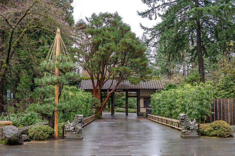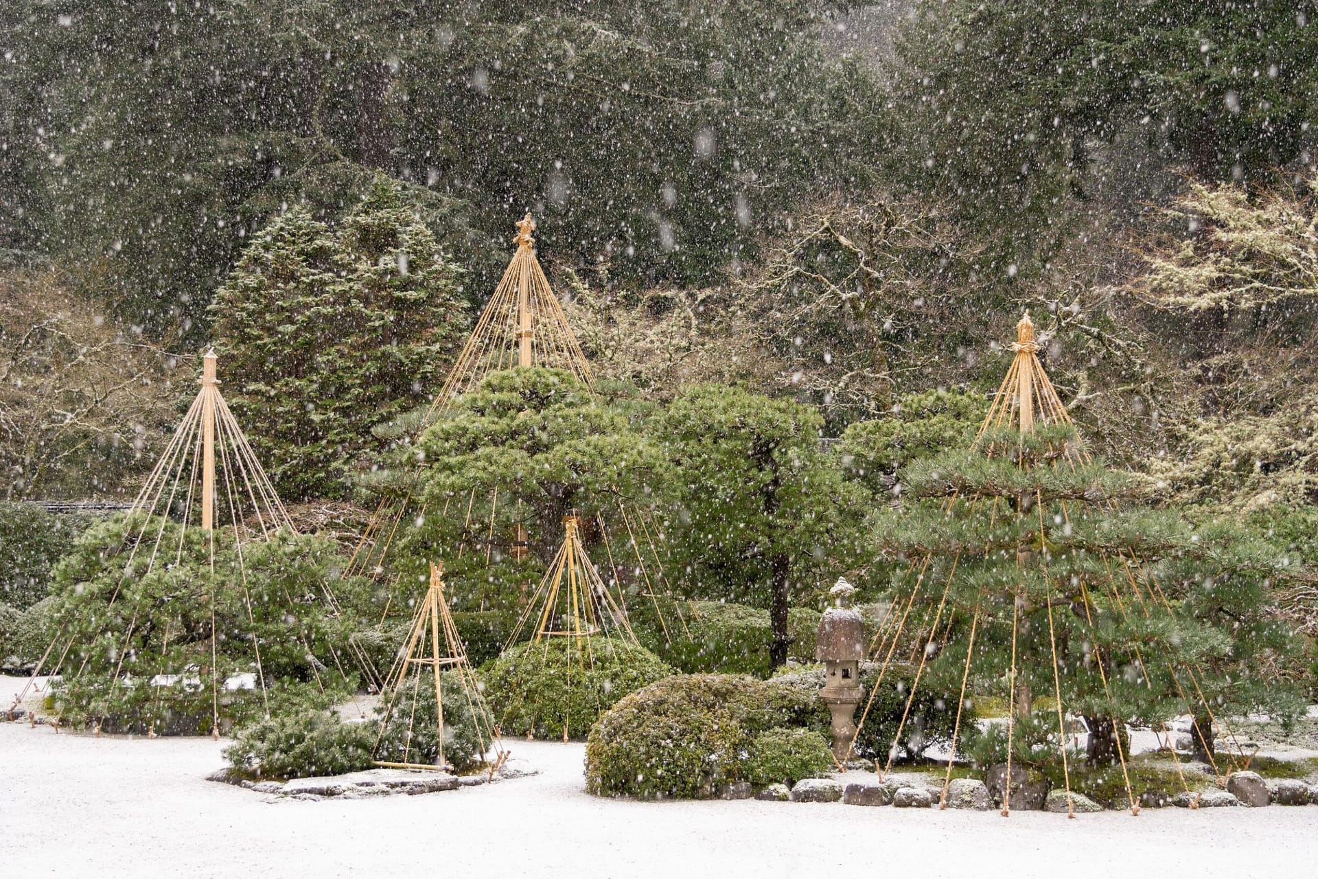Visitors to Portland Japanese Garden in winter will be able to see additions to its grounds that have only recently returned since the 1990s: yukizuri (sometimes transliterated as “yukitsuri”). Yukizuri (雪吊り) are aesthetically pleasing support systems that protect and prepare trees for winter—yuki means “snow” and zuri or tsuri means “lifting.” In this we understand precisely how they help protect trees: Straw ropes are cast down from a central pole, almost like the frame of an umbrella. The ropes are then tied to branches to help lift them up with the thought being they’ll better withstand the weight of heavy snowfall or frost.
