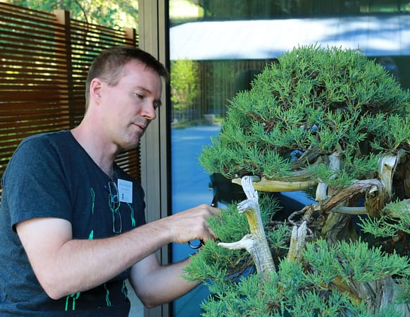 “Bonsai can be almost anything that gets woody. I have a student that has a poison ivy bonsai but, no, I do not recommend that.” Sound advice from Michael Hagedorn, bonsai expert and consultant to Portland Japanese Garden. Hagedorn laughed as he answered light-hearted questions by curious onlookers – while trimming the spring shoots off …