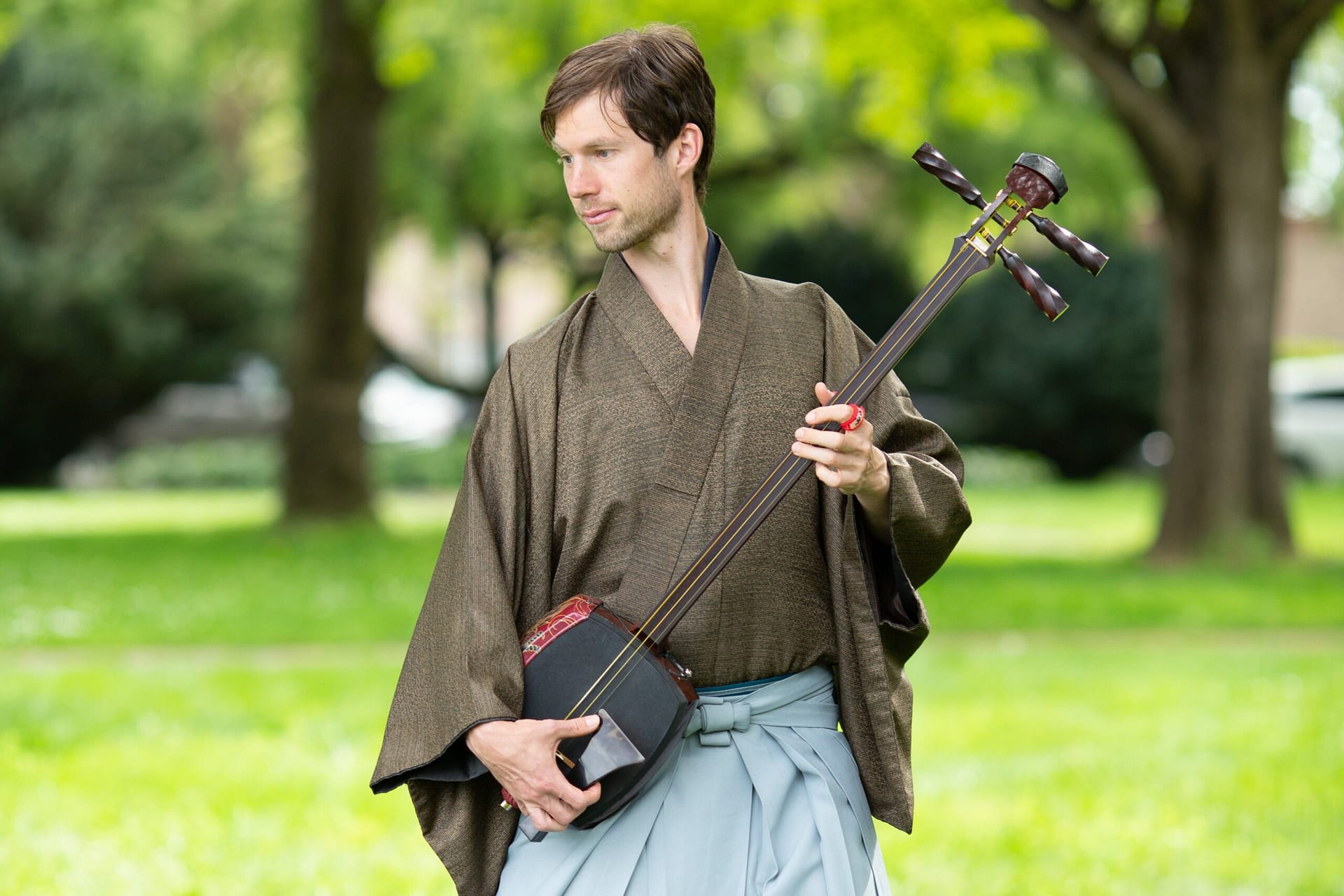 With over 20 years of experience, Kyle Abbott performs, repairs, and teaches shamisen worldwide, and has founded Bachido, the first international shamisen community.
