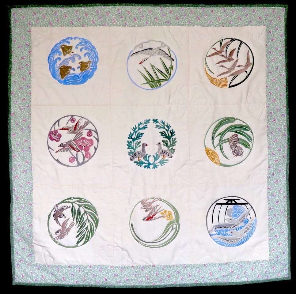 Karen Miller was a marine biologist at Oregon State University and her art is often inspired by her scientific background. Her interest in textiles and Japan dates extends back to her childhood. In 1994, she was introduced to katazome and carved her first stencil, which was a turning point in her artistic life. She studied the craft with American katazome expert John Marshall and began carving stencils using mostly traditional Japanese patterns. Now using her own hand-cut and personally designed stencils, Miller produces fabric for art quilts, silk garments, linen hangings, and indigo-dyed cottons. She is passionate about the patterns found in natural forms and detailed biological images like tree branches, leaf skeletons, or marine animals, and especially the abstractions nature produces.