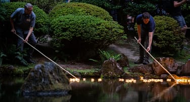 O-Bon: Honoring Ancestral Spirits is a special gathering for Portland Japanese Garden members. Light lanterns in memory of loved ones, and set them afloat in the Upper Pond near the Moon Bridge. It is a truly unique and moving ceremony.