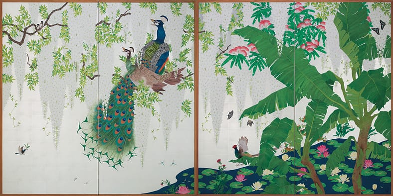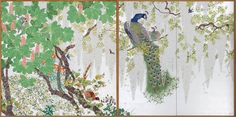 Daisuke Nakano is an avant-garde visual artist who uses the centuries-old Nihonga-style painting technique to capture the elusiveness of light and vivacious spirit of wildlife through his screen paintings of imaginary botanical landscapes. Nihonga (日本画), a traditional style of Japanese painting, is created using solely organic materials — such as pigments from vegetables, minerals, animals, silk, wood, and gold.