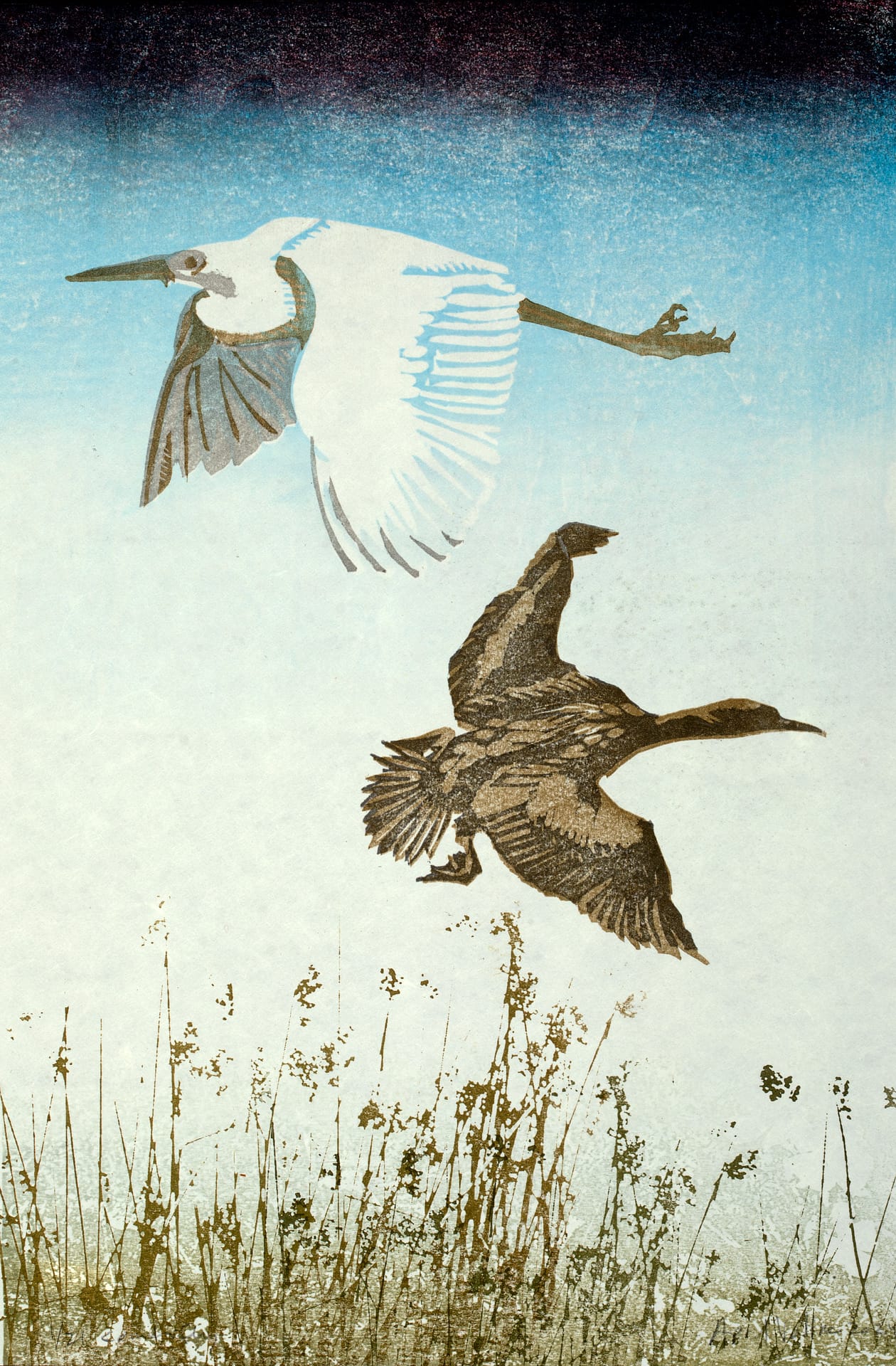 Vollmer’s prints are often autobiographical, revolving around personal experience spent between the metropolis of New York and the coastal ecology of California. For Enduring Impressions, she shared a series based on images of local birds flying over California’s native coastal vegetation: wild cucumber, primrose, and tule. While she often explores themes around how nature is affected by climate change, pollution, population pressure and