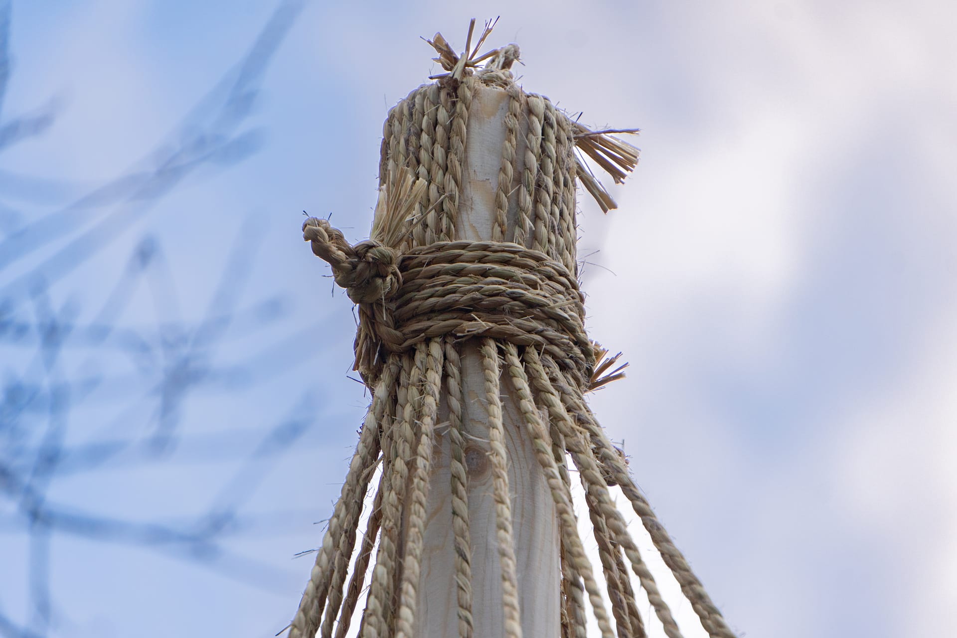 Yukizuri have been installed in two locations this year. Trees in the Flat Garden, including its weeping cherry and maples, feature yukizuri with ropes tied to spikes driven into the raked gravel. In the Cultural Village, ropes will be tied directly to tree limbs. While Portland’s typical winters don’t bring the heavy snowfall seen in Japan, these additions serve as an aesthetic touch, showcasing the craftsmanship and cultural traditions of Japanese gardens. The Garden’s rice straw ropes, reminiscent of shimenawa, are favored in Kanazawa and used in Shinto rituals. These ropes symbolize the border of sacred spaces and act as a ward against evil spirits.