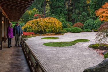 The Flat Garden is meant to be seen from a single viewpoint, framed by the sliding shoji doors if viewed from inside the Pavilion or by the veranda itself if viewed from outside. This enclosed view can be appreciated in much the same way we would appreciate a landscape painting — perhaps a view of a shoreline across the water of the raked gravel plane. Mountains and hills are depicted in the rounded shapes of the azalea shrubs.
